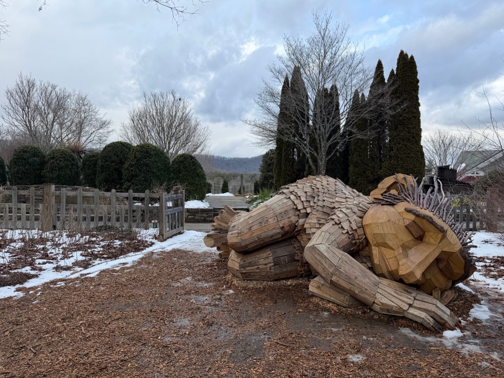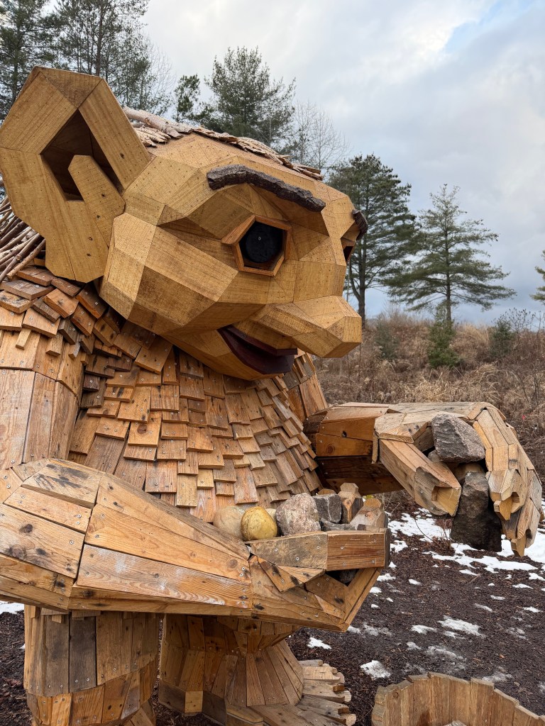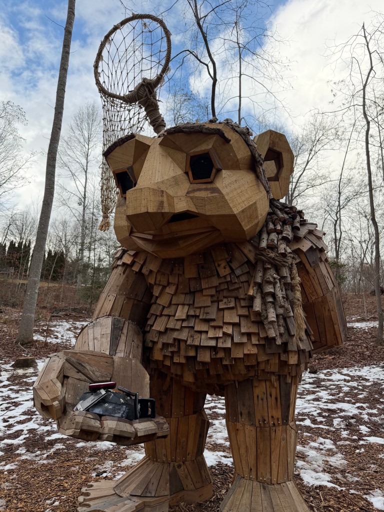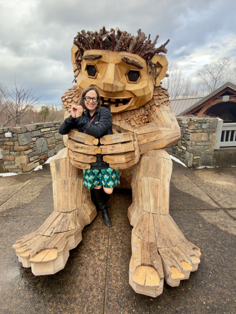 We had dinner plans. She suggested we got to the North Carolina Arboretum instead/in addition to visit Thomas Dambo’s “Trolls: A Field Study” exhibition. It was the perfect day for it. Cold, but not as cold as the recent single digit snowy temperatures. A pleasant chilly. Gray and drizzly. Not many other visitors. An ideal day to saunter through the Arboretum and enjoy the calming force of being among copses of trees, walking on paths covered with soft pine needles.