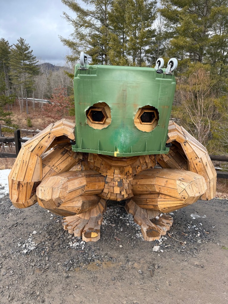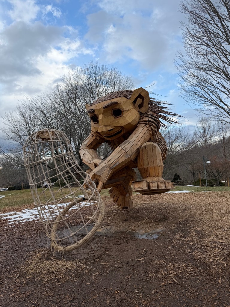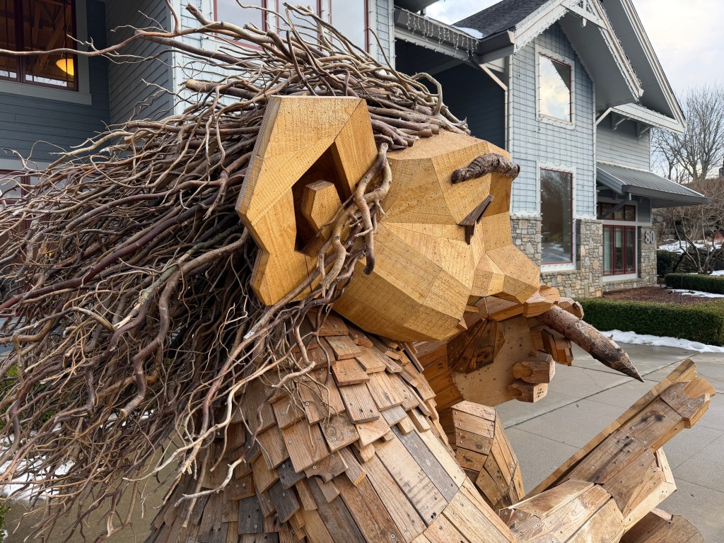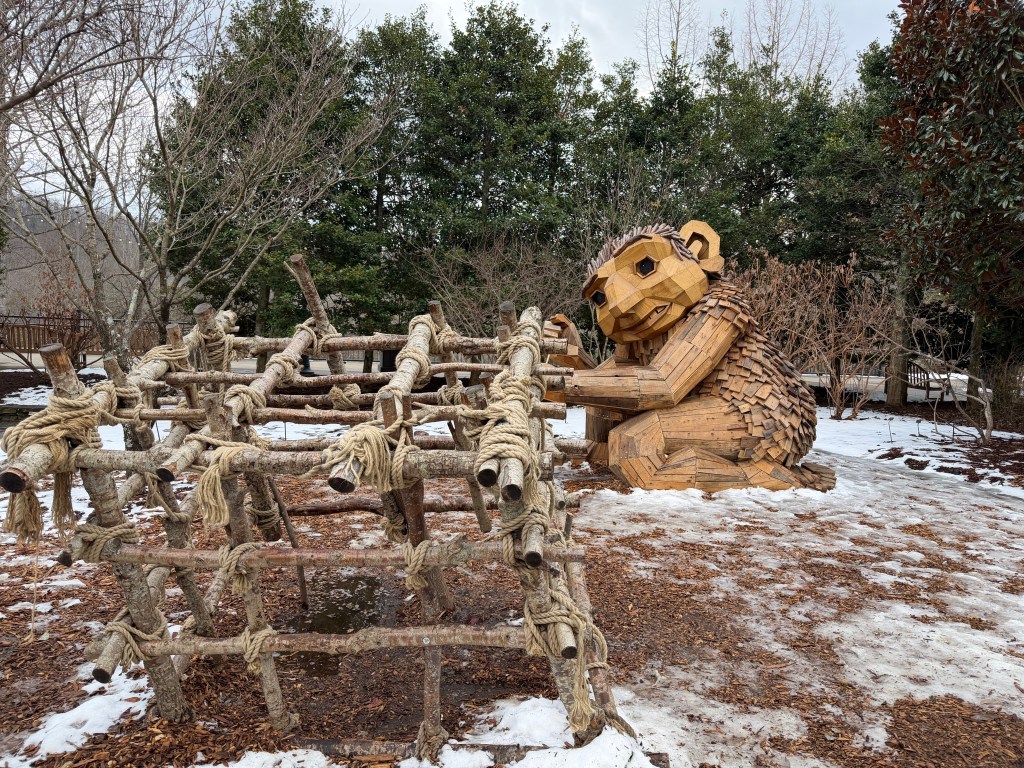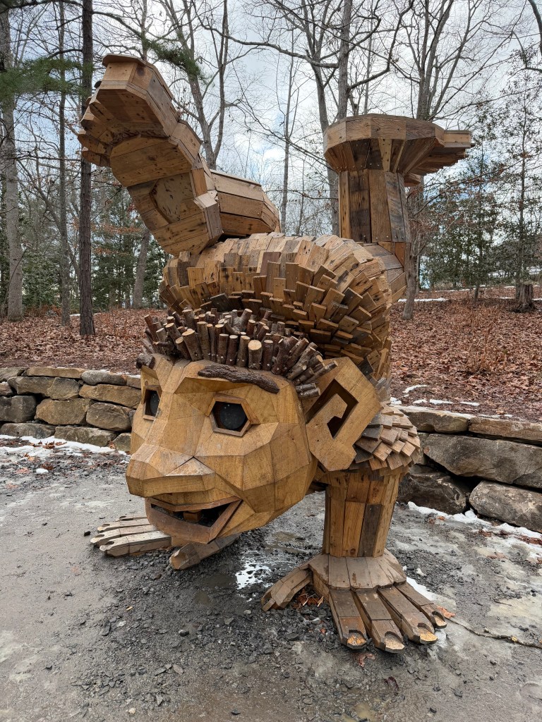 We had dinner plans. She suggested we got to the North Carolina Arboretum instead/in addition to visit Thomas Dambo’s “Trolls: A Field Study” exhibition. It was the perfect day for it. Cold, but not as cold as the recent single digit snowy temperatures. A pleasant chilly. Gray and drizzly. Not many other visitors. An ideal day to saunter through the Arboretum and enjoy the calming force of being among copses of trees, walking on paths covered with soft pine needles.