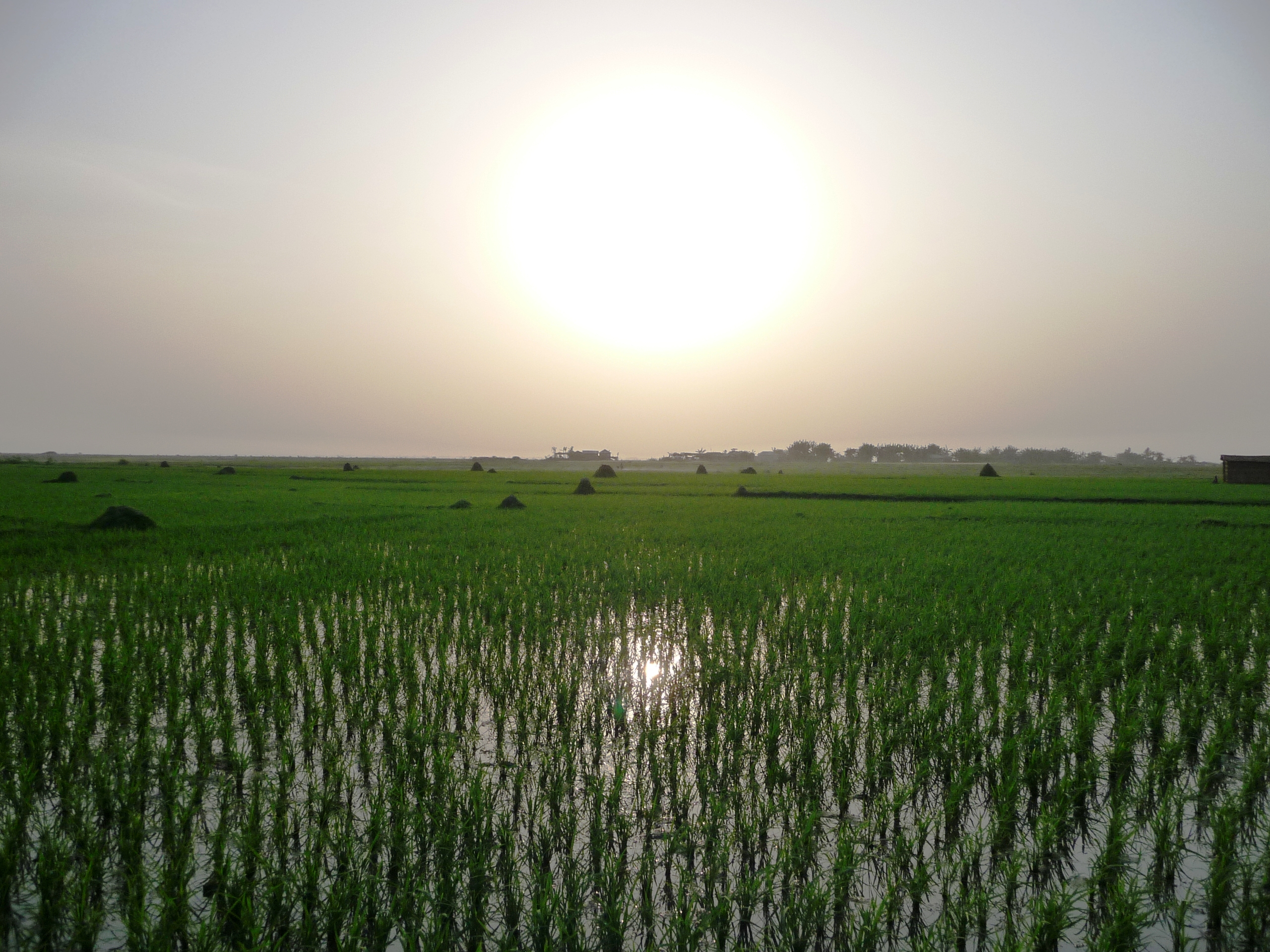 As we walked from the village to the river to catch our boat back to the mainland, the sun was setting over the rice fields, creating beautiful reflections in the paddies.