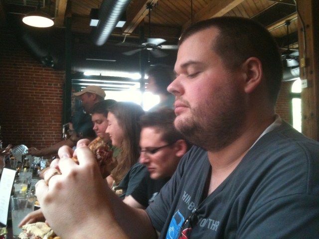 We started the day with a trip to Schlafly micro-brewery and tap room for lunch. Reading the menu, I see “One pound Reuben” and “Plate of Swine.” Oh, decadence. We gasped as platters of food arrived, more than any of us could consume in one sitting. Here, Ryan ponders how to attack the one pound Reuben.