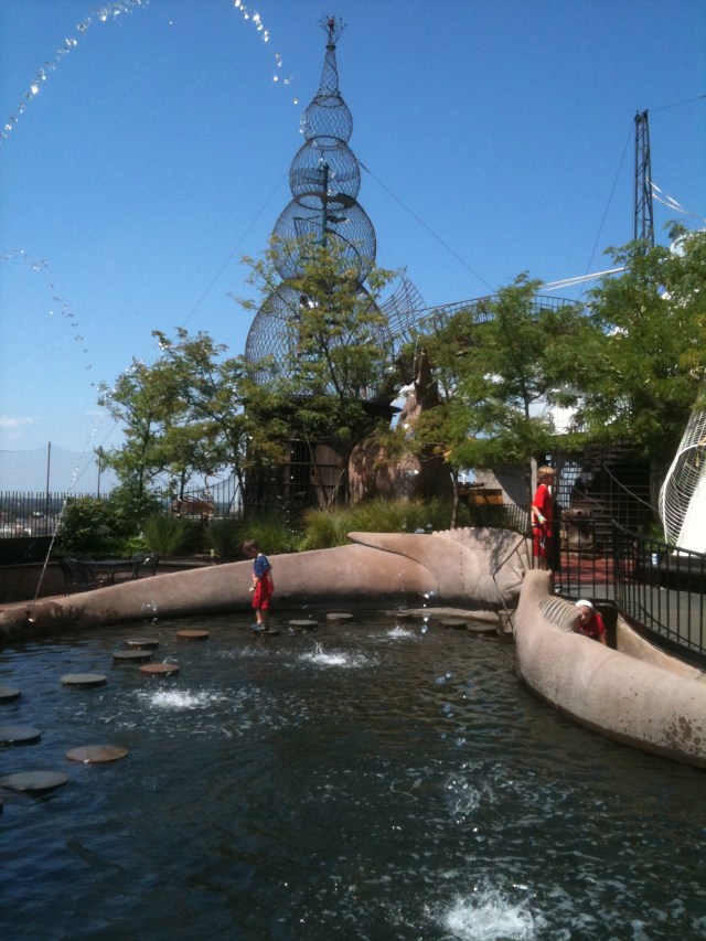 From there it’s over to the City Museum, a wacky, incredible amusement of a place. I love places like this. Someone has a vision – let’s take recycled materials and do something utterly amazing with them. Like, make a museum. First stop, rooftop, to take our chance on the 10 story slide. As we were waiting in line, an employee asked, “Do you want to go really fast?” What kind of question is that? “Yes!” we screamed. So he preceded us down the corkscrew slide, spraying a teflon-like substance, making the metal slide even more slippery and fast. There’s something ultimately exhilarating about winding down story after story, hearing your screams of glee reverberating off of close metal walls. The slide dumped us into caves that we had an unusually difficult time exiting, but it was the most fun I’ve ever had being lost. The caves involved cages, and tunnels, and very dark passages that required squatting or crawling. After an inordinate amount of time, we found ourselves in the elevator back up to the rooftop. I looked up, surprised to see children crawling along the 50 foot high domed ceiling, protected by insanely close metal casings that allowed 18 inches or so of crawl space. We amused ourselves with the school bus cantilevered over the edge of the roof, the giant slide under a parachute, and a ferris wheel perched delicately on the roof. And then our time was up.