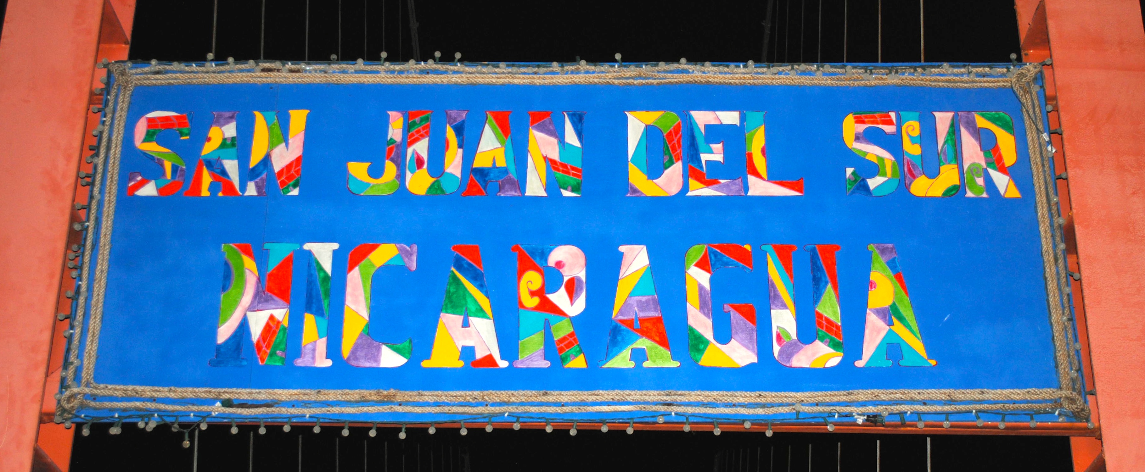 Sign over the wobbly suspension bridge leading to the town