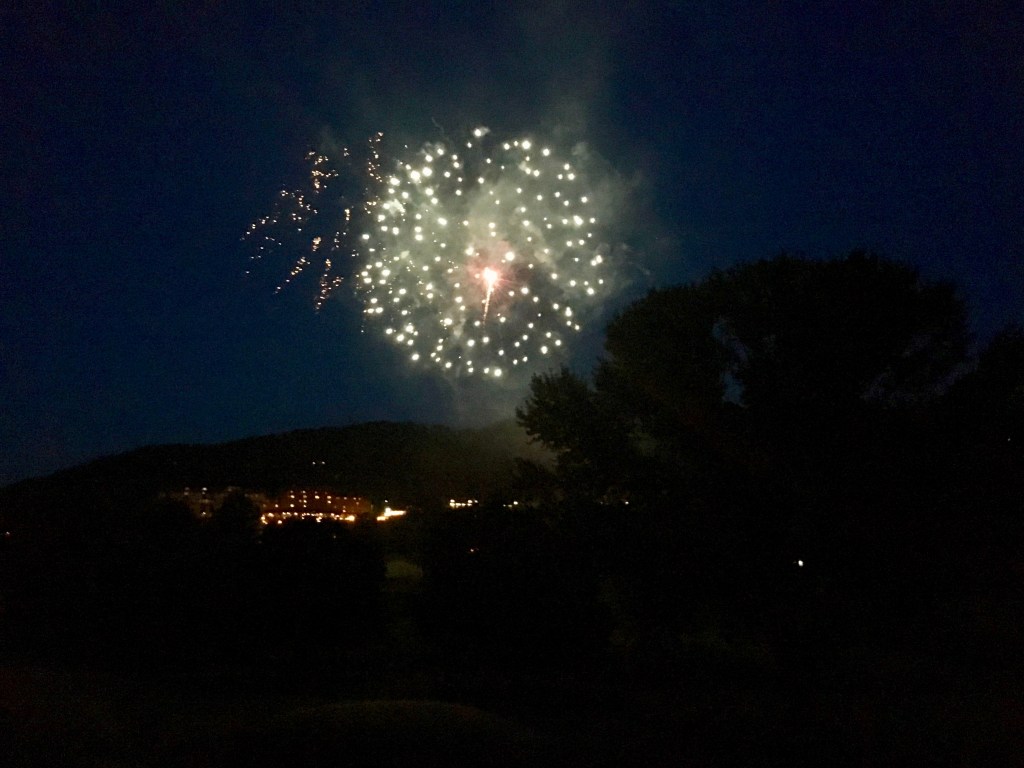 This year was different. We watched as fireworks shot into the air, whizzing then bursting, sparkles fluttering down to earth. The boom echoed against the mountains, a cacophony of timpani filling the valley. And it was hot. The humid hot of the south in the summer. The hot that makes you sweat just enough so that when a gentle breeze blows you think, “Ahhhh, that feels divine.”