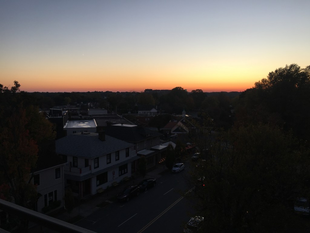 I walked out on the balcony. The sun was setting and the sky was turning from pink to orange to blue to violet. My favorite time of day. My favorite place to be. When I lived with Mom and Dad earlier this year, I would bundle up and sit in the rocker as the sun went down and just be. Not think about work, or what I needed to do, or Dad’s medical prognosis, or Mom’s recent cognitive assessment. I watched the sun set for the last time from this vantage point. And I cried some more.