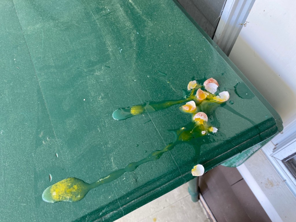 Around noon, I peeked out the door to see if the mail had come. I noticed something on the table below the nest. What was that?