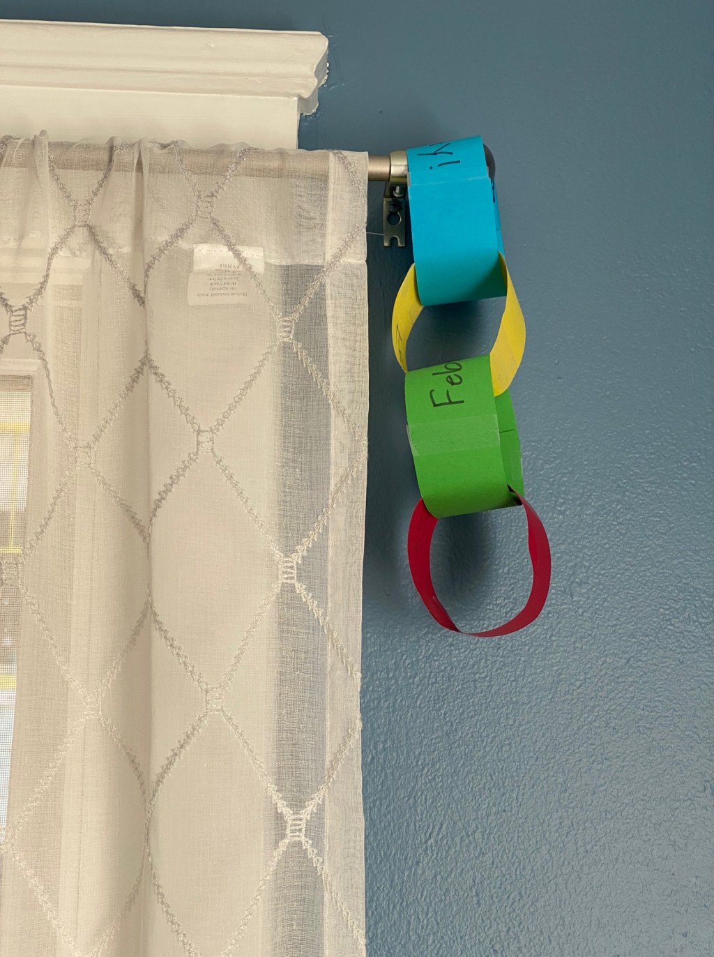 So we made a paper chain, with each link one day. At first the chain reached from high on the curtain rod close to the floor. And a week later it was to the window sill. And a week later it was high enough that I had to tear off the link because Mom couldn’t reach it.