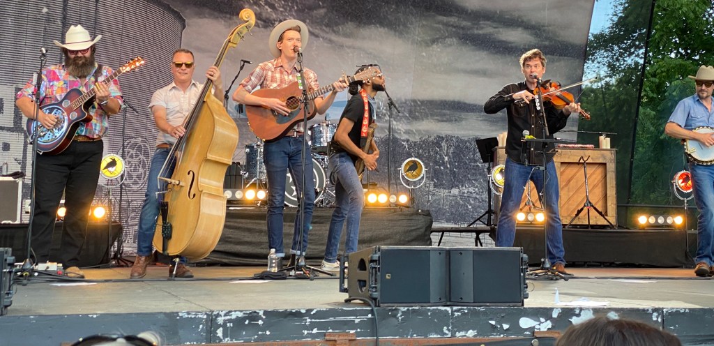 2022. Salvage Station, Asheville, NC. Old Crow Medicine Show. Holy wow. This is how this band needs to be seen and heard. On a huge outdoor stage, on a beautiful summer night, watching the sky turn from clear to dusky blue to midnight black, a half moon rising over the river. Enough stage space for hijinks to abound. Enough audience space for singing and smiling and dancing. So grateful for a wonderful night.