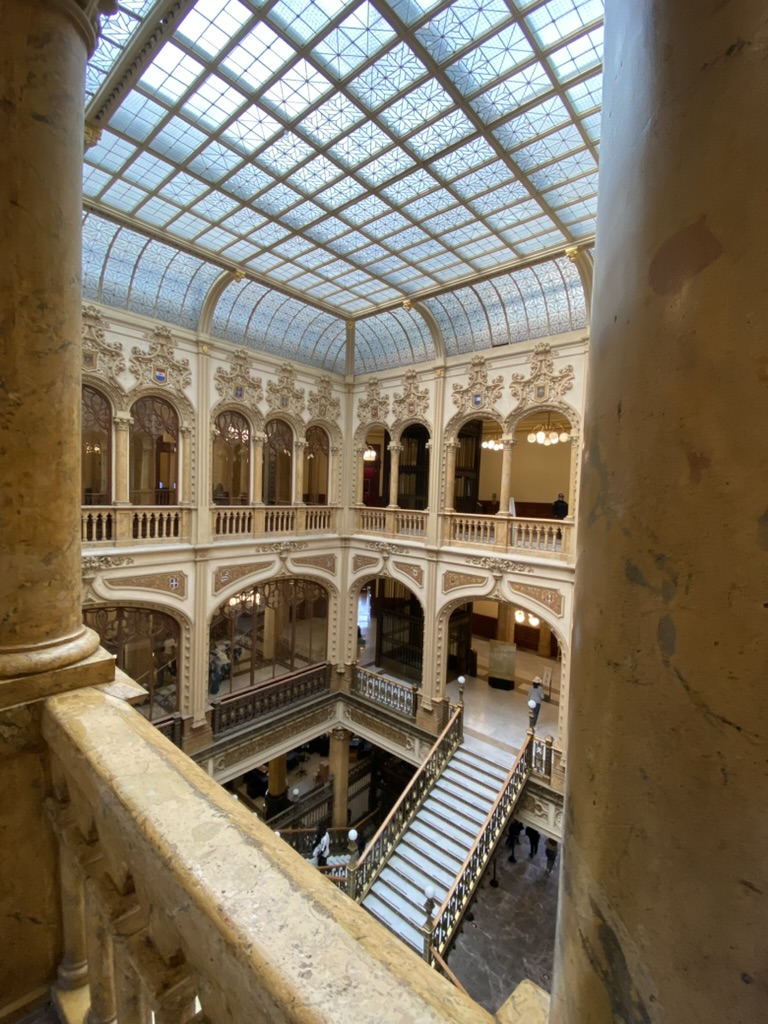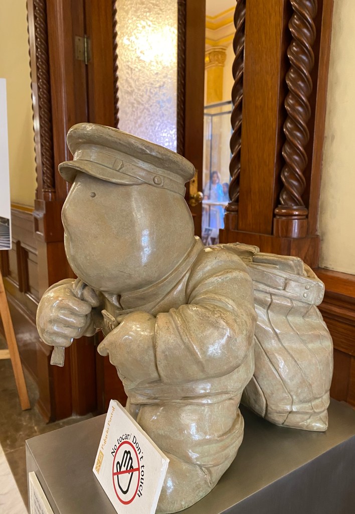 We shared many dinners and excursions together, and shared tips on the things we had done apart. She recommended the Palacio de Correos de Mexico and I was enamored. I love all things mail. I love stamps. I love connecting through the written word. And. Oh, my goodness. The extravagance. The opulence. I repeatedly oohed and ahhed and gaped and gasped. I couldn’t believe such a structure had been built as a post office. And the preservation! Marble and gild and art and stone and mahogany and brass and statues and…