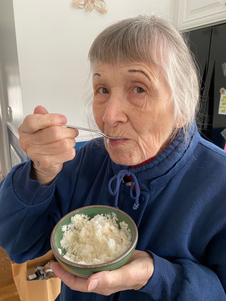 Sadly, this didn’t dislodge distant memories for Mom. She kept saying, “This is so good. I’ve never had this before!” And as soon as I washed the bowls, she came into the kitchen, asking for some more of the cold white stuff. All in all, a win.