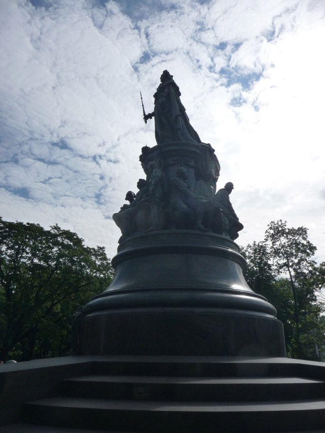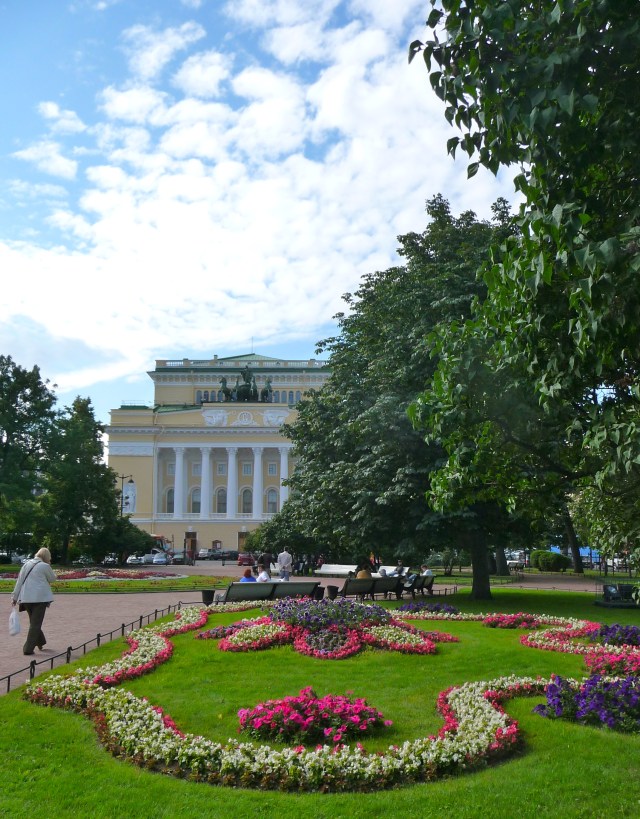 We crossed the street and entered Ostrovsky Square, greeted by men and women hawking river tours over loudspeakers, flanked by vendors selling soft drinks and ice creams from mobile carts. We entered the park, walking around a huge statue of Catherine the Great and her advisors, towards the Alexandrinsky Theatre. Beds of bright pink, purple, and yellow flowers bloomed along the path, making the overcast day seem brighter.