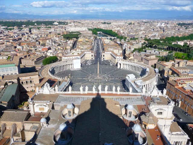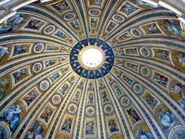 I walked around, marveling at the gigantic nature of the building; watching the faithful dip their fingers in the holy water and cross themselves; and staring at the impressive statues throughout the church. A mass was beginning, so I wasn’t able to stand beneath Michelangelo’s majestic dome, just close to it. A friend had recommended I descend to the grotto, then ascend secret steps to the dome. I asked a guard where the steps to the grotto were. He shook his head, “Closed. Close at 4 o’clock.” Shoot. “Can I climb to the dome?” “Yes,” he said. “Exit, then turn left.”