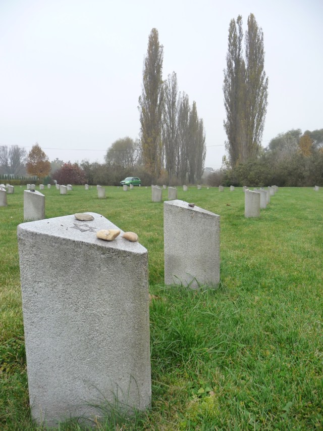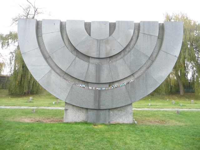 Next, the cemetery. We walked down a long road flanked by trees losing their leaves. The first thing we saw was an oversized menorah, surrounded by hundreds of identical tombstones. The day was cold and grey, fitting for visiting a cemetery. I walked among the tombstones, noticing that small rocks had been placed on top of many of them. The tour guide called me to join him near a building.